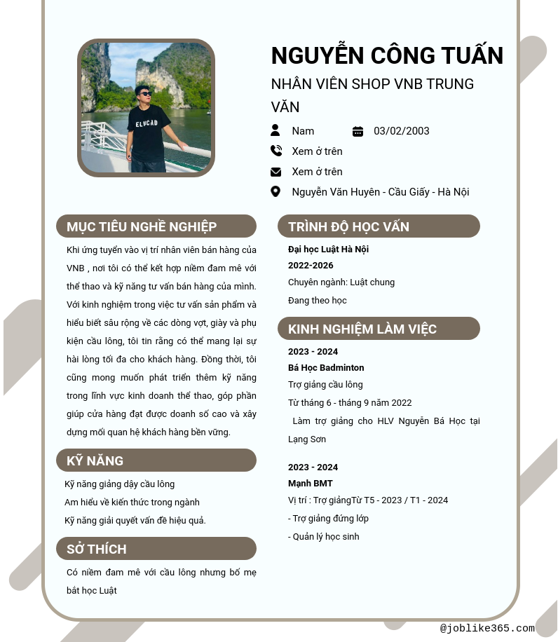 Xem hồ sơ ứng viên NGuyễn công tuấn cần 2 điểm. Hồ sơ được cập nhật ngày: 10/10/2024
