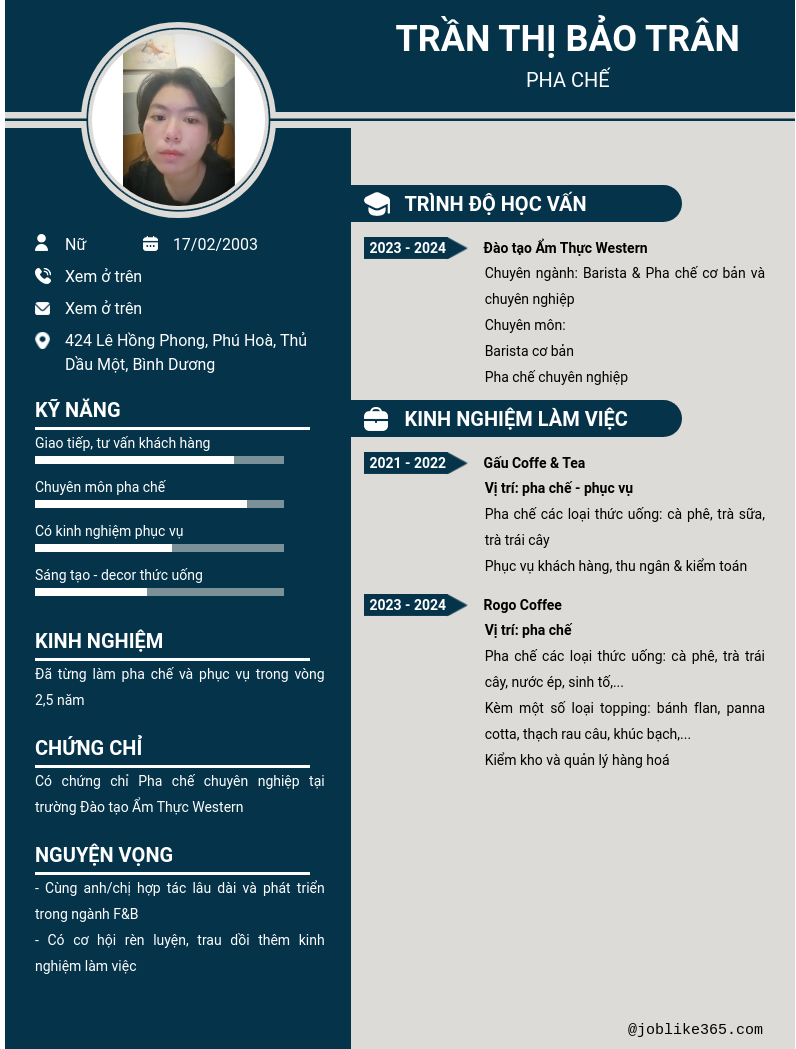 Xem hồ sơ ứng viên Trần Thị Bảo Trân cần 2 điểm. Hồ sơ được cập nhật ngày: 06/01/2025
