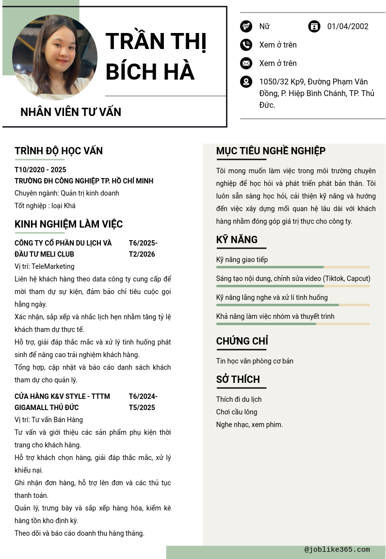 Xem hồ sơ ứng viên TRẦN THỊ bích hà cần 2 điểm. Hồ sơ được cập nhật ngày: 01/03/2026