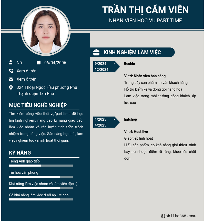Xem hồ sơ ứng viên Trần Thị Cẩm Viên cần 2 điểm. Hồ sơ được cập nhật ngày: 02/05/2025