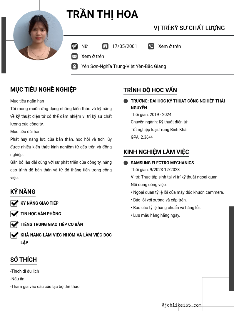 Xem hồ sơ ứng viên Trần thị hoa cần 2 điểm. Hồ sơ được cập nhật ngày: 07/12/2024