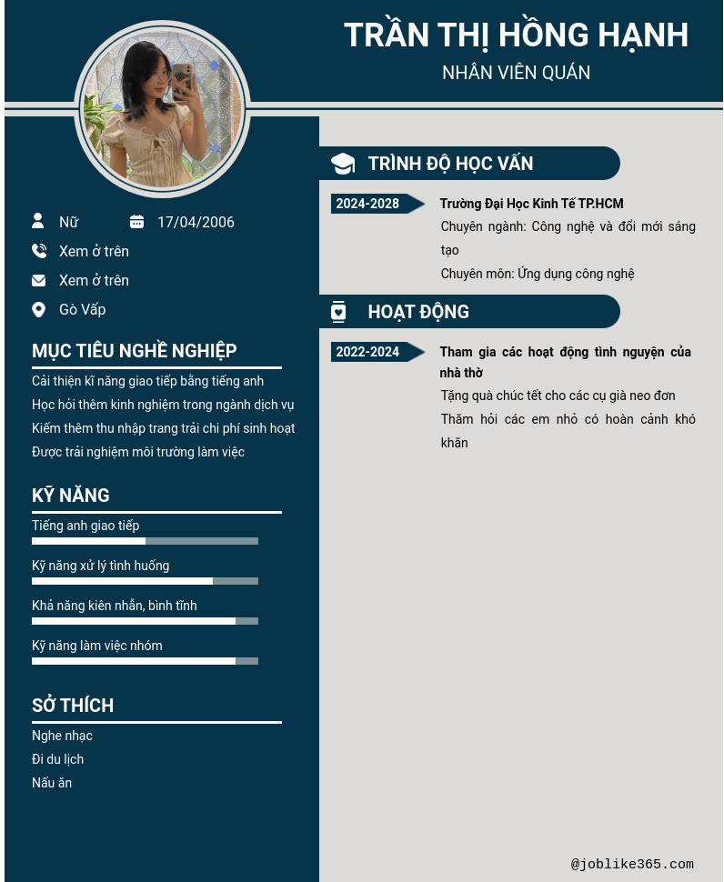 Xem hồ sơ ứng viên Trần Thị Hồng Hạnh cần 2 điểm. Hồ sơ được cập nhật ngày: 31/10/2024