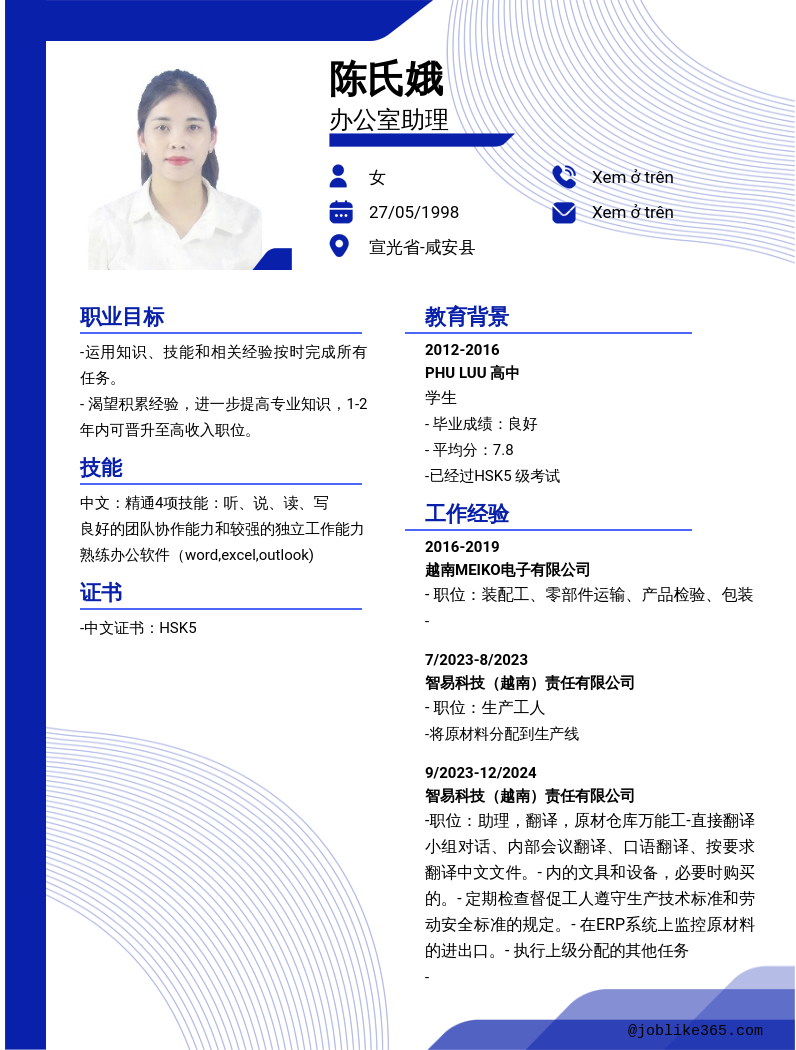 Xem hồ sơ ứng viên 陈氏娥 cần 2 điểm. Hồ sơ được cập nhật ngày: 31/12/2024