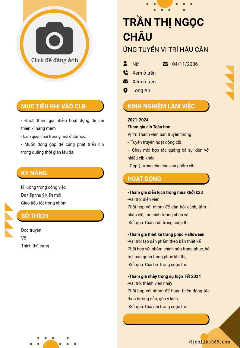 Xem hồ sơ ứng viên TRẦN THỊ NGỌC CHÂU cần 2 điểm. Hồ sơ được cập nhật ngày: 30/08/2024