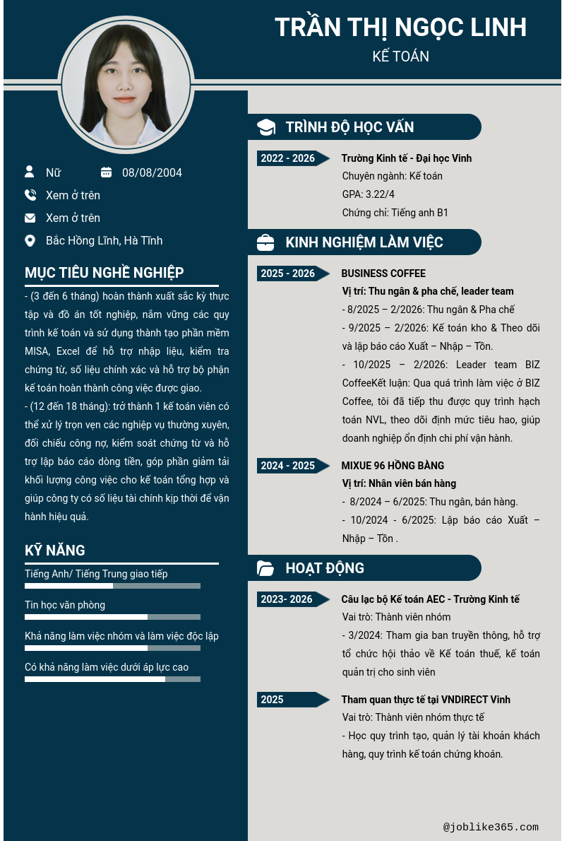 Xem hồ sơ ứng viên TRầN THị NGọC LINH cần 2 điểm. Hồ sơ được cập nhật ngày: 05/02/2026
