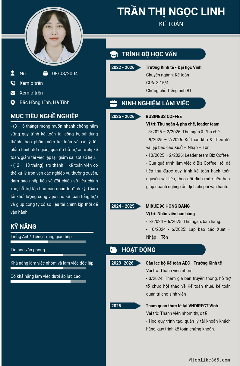 Xem hồ sơ ứng viên TRầN THị NGọC LINH cần 2 điểm. Hồ sơ được cập nhật ngày: 30/01/2026