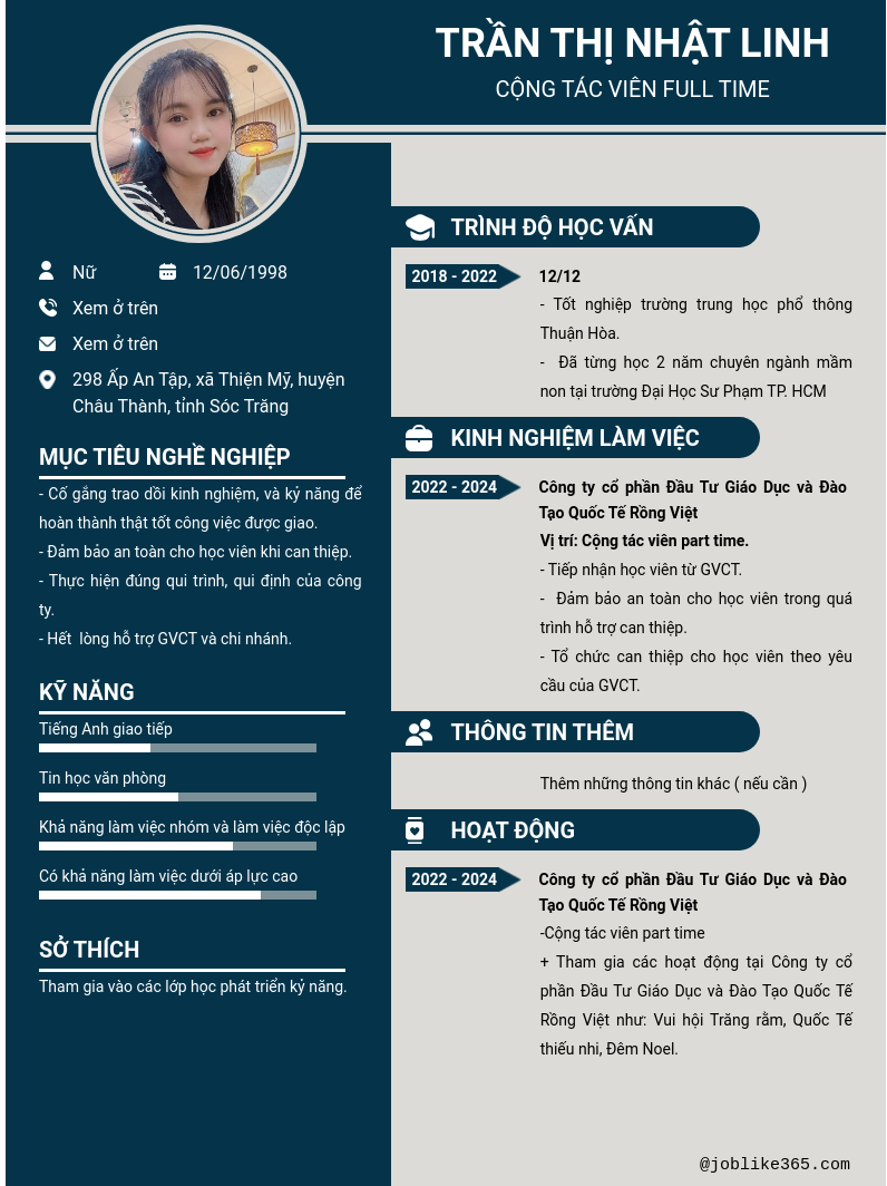 Xem hồ sơ ứng viên Trần Thị Nhật Linh cần 2 điểm. Hồ sơ được cập nhật ngày: 15/08/2024
