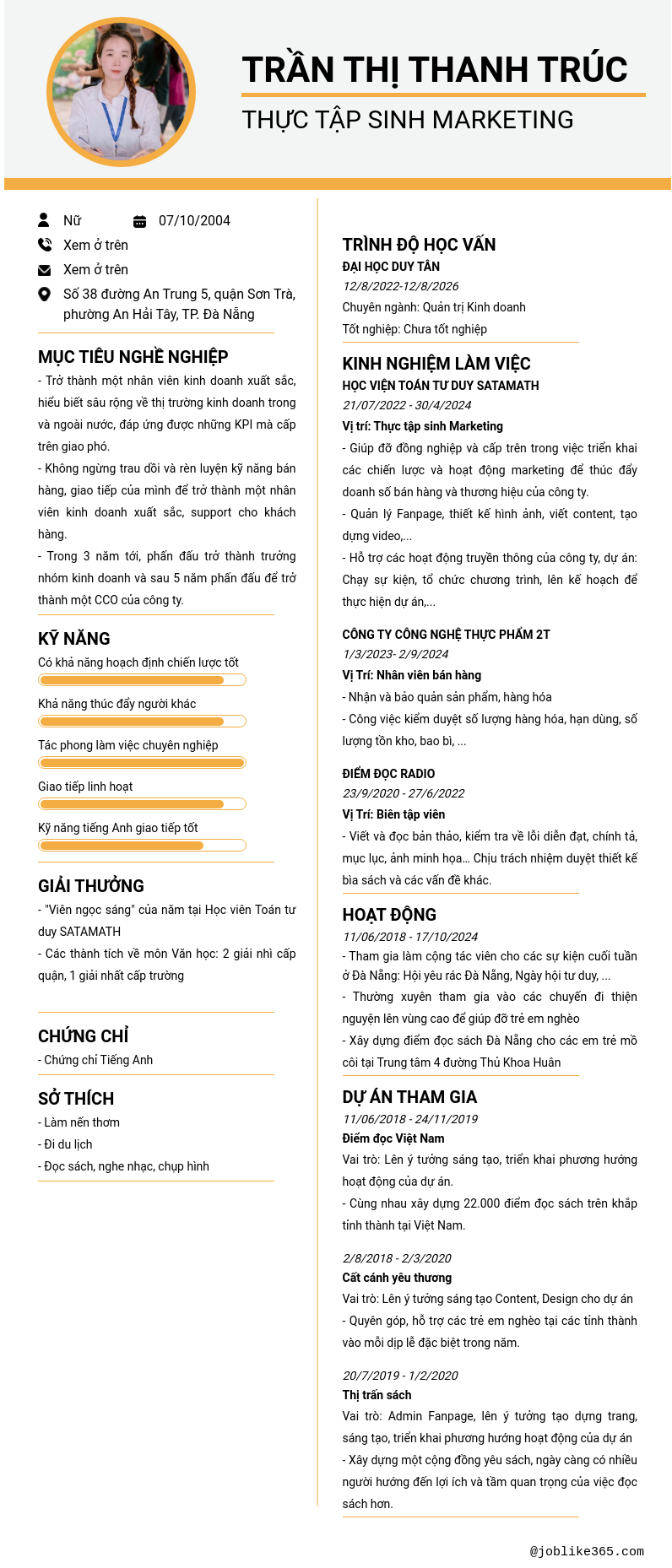 Xem hồ sơ ứng viên TRẦn thị thanh trúc cần 2 điểm. Hồ sơ được cập nhật ngày: 21/10/2024
