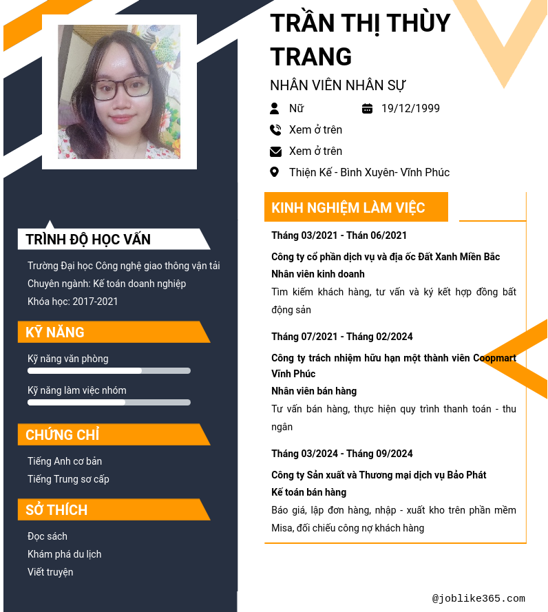 Xem hồ sơ ứng viên TRẦN THỊ THÙY TRANG cần 2 điểm. Hồ sơ được cập nhật ngày: 30/09/2024