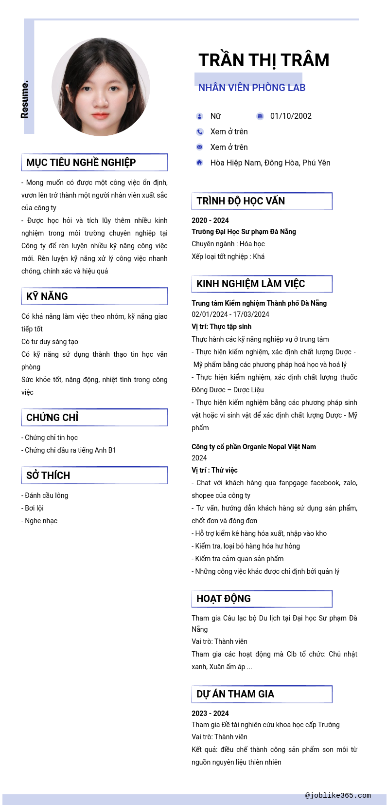 Xem hồ sơ ứng viên TRẦN THỊ TRÂM cần 2 điểm. Hồ sơ được cập nhật ngày: 09/12/2024
