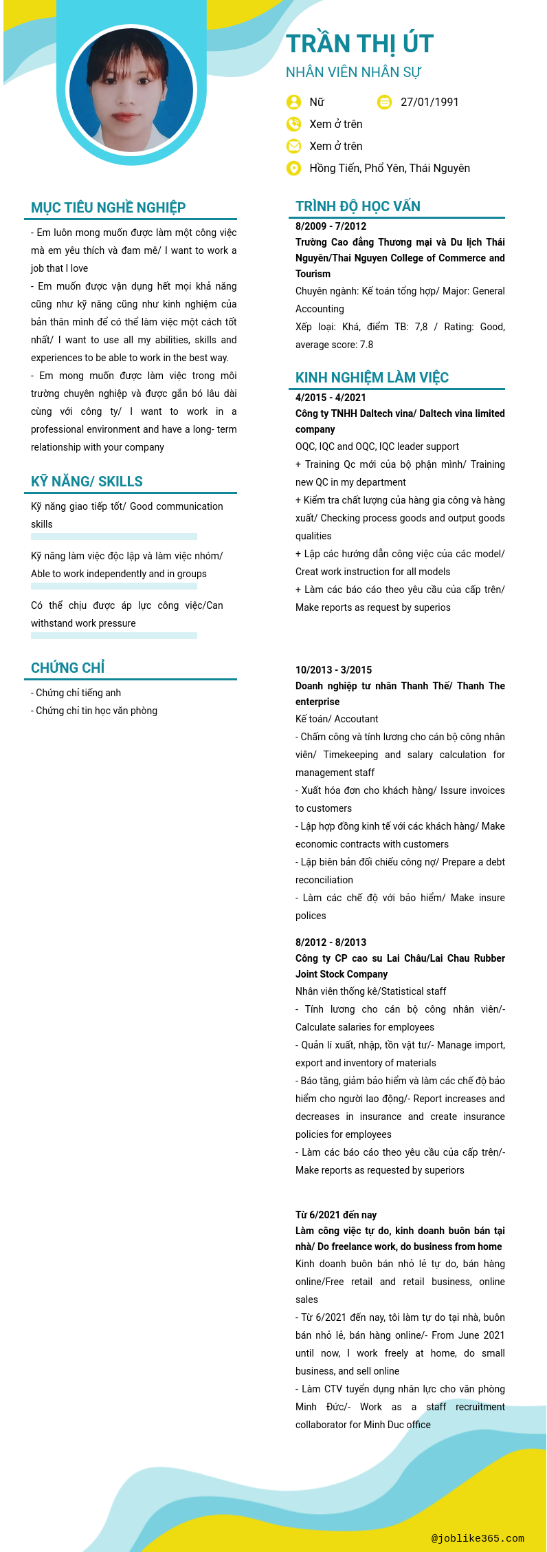 Xem hồ sơ ứng viên TRẦN THỊ ÚT cần 2 điểm. Hồ sơ được cập nhật ngày: 22/08/2024