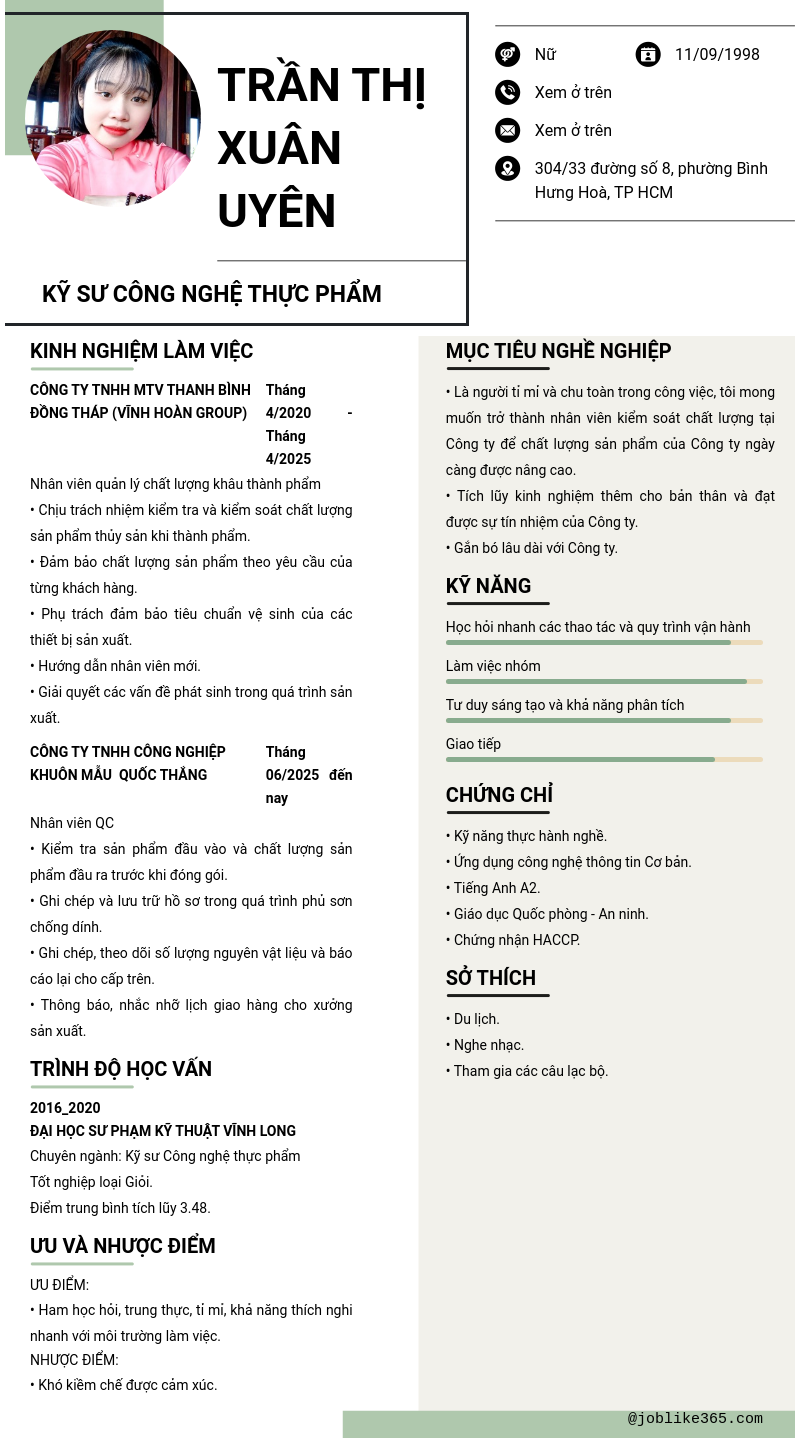 Xem hồ sơ ứng viên TRẦN THỊ XUÂN UYÊN cần 2 điểm. Hồ sơ được cập nhật ngày: 08/02/2026