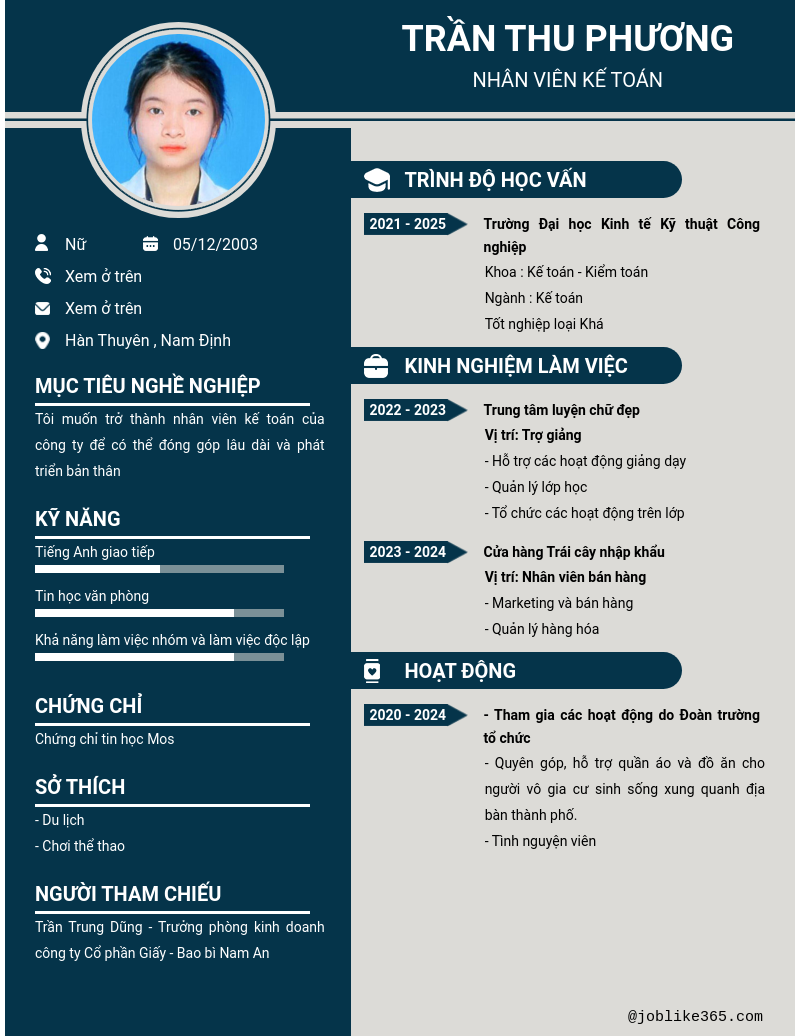 Xem hồ sơ ứng viên TRẦN THU PHƯƠNG cần 2 điểm. Hồ sơ được cập nhật ngày: 05/12/2024