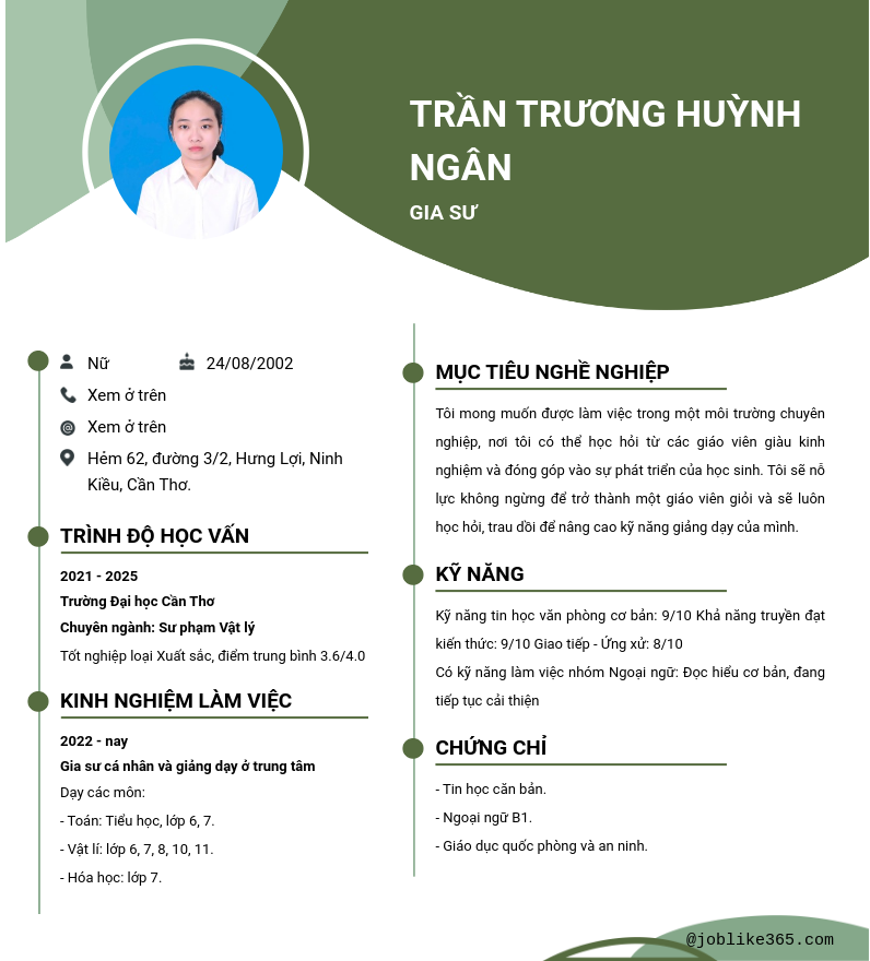 Xem hồ sơ ứng viên Trần trương huỳnh ngân cần 2 điểm. Hồ sơ được cập nhật ngày: 09/08/2025