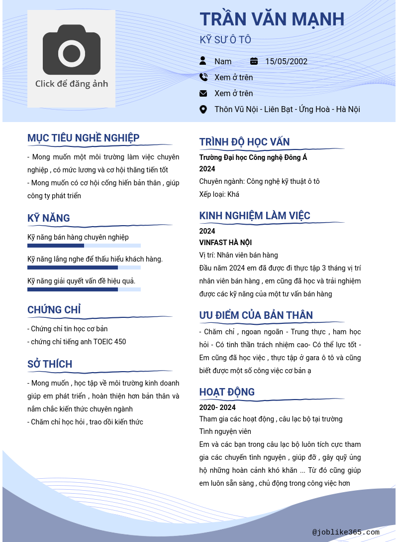 Xem hồ sơ ứng viên Trần Văn Mạnh cần 2 điểm. Hồ sơ được cập nhật ngày: 27/12/2024