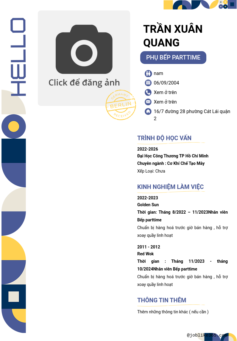 Xem hồ sơ ứng viên Trần Xuân Quang cần 2 điểm. Hồ sơ được cập nhật ngày: 03/11/2024
