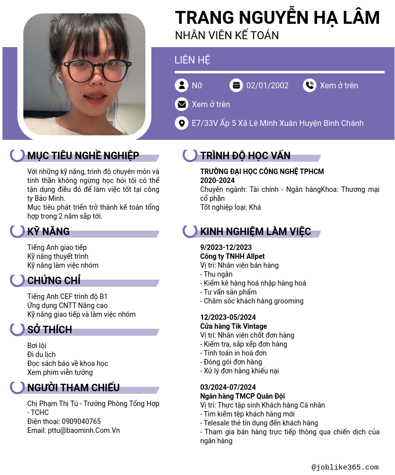 Xem hồ sơ ứng viên trang nguyễn hạ lâm cần 2 điểm. Hồ sơ được cập nhật ngày: 13/10/2024