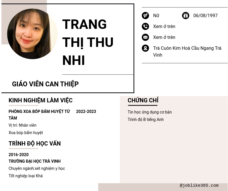 Xem hồ sơ ứng viên Trang Thị Thu Nhi cần 2 điểm. Hồ sơ được cập nhật ngày: 23/07/2024