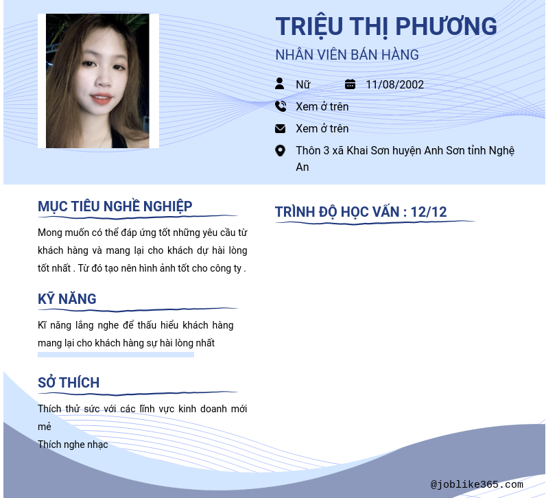 Xem hồ sơ ứng viên TRIỆU THỊ PHƯƠNG cần 2 điểm. Hồ sơ được cập nhật ngày: 20/09/2024