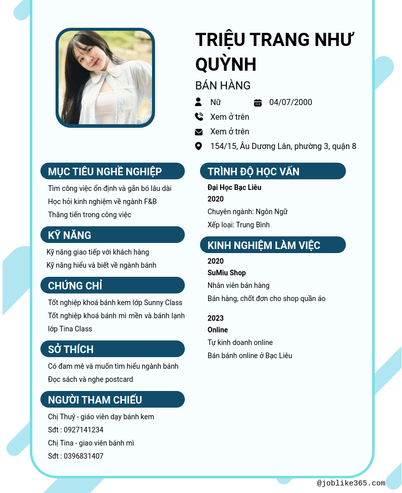 Xem hồ sơ ứng viên Triệu Trang Như Quỳnh cần 2 điểm. Hồ sơ được cập nhật ngày: 12/09/2025