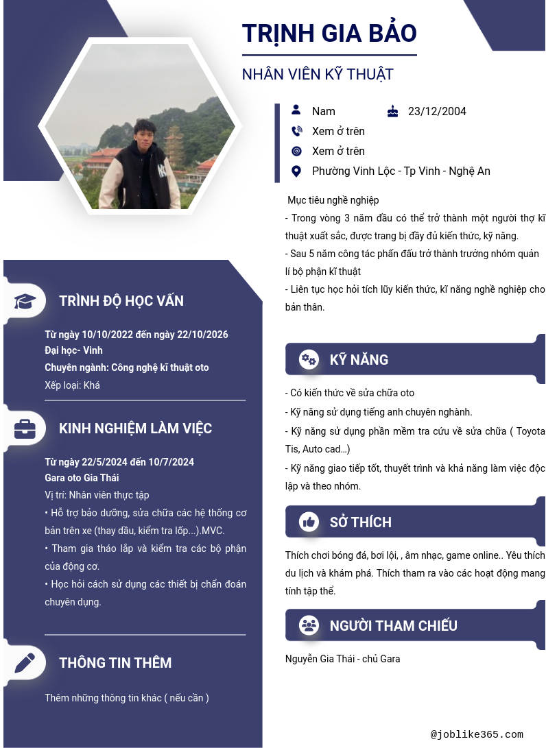 Xem hồ sơ ứng viên trịnh gia bảo cần 2 điểm. Hồ sơ được cập nhật ngày: 24/08/2025