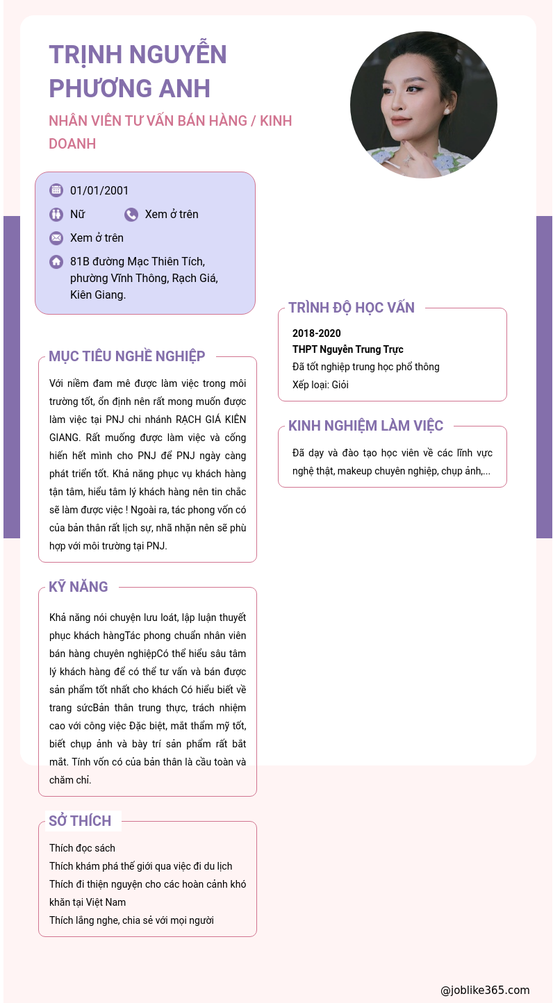 Xem hồ sơ ứng viên TRỊNH NGUYỄN PHƯƠNG ANH cần 2 điểm. Hồ sơ được cập nhật ngày: 01/07/2024