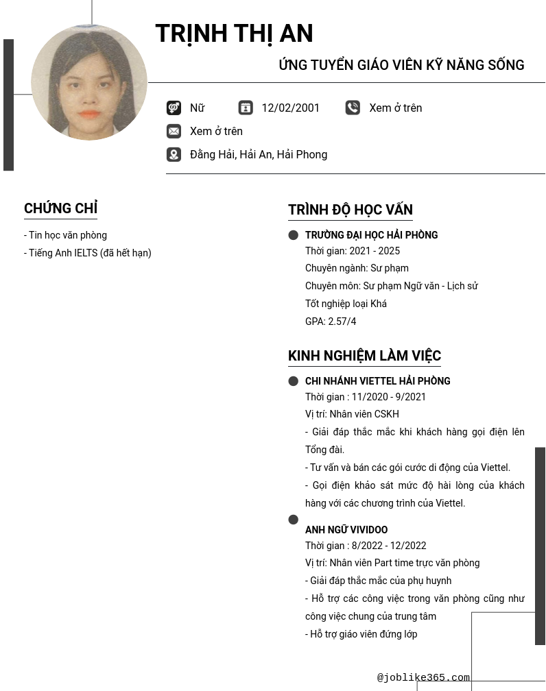 Xem hồ sơ ứng viên TRỊNH THỊ AN cần 2 điểm. Hồ sơ được cập nhật ngày: 31/07/2025