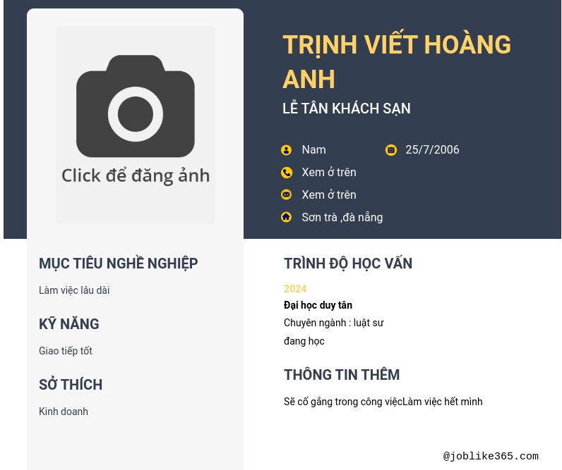 Xem hồ sơ ứng viên Trịnh Viết Hoàng Anh cần 2 điểm. Hồ sơ được cập nhật ngày: 23/09/2024