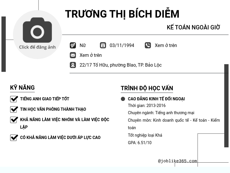 Xem hồ sơ ứng viên trương thị bích diễm cần 2 điểm. Hồ sơ được cập nhật ngày: 20/03/2026