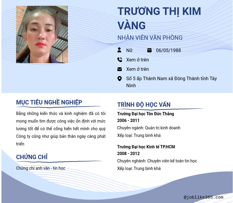 Xem hồ sơ ứng viên TRƯƠNG THỊ KIM VÀNG cần 2 điểm. Hồ sơ được cập nhật ngày: 24/02/2026