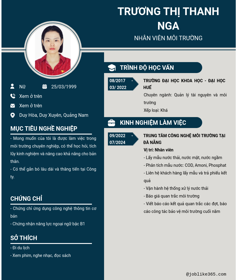 Xem hồ sơ ứng viên TRƯƠNG THỊ THANH NGA cần 2 điểm. Hồ sơ được cập nhật ngày: 28/03/2025