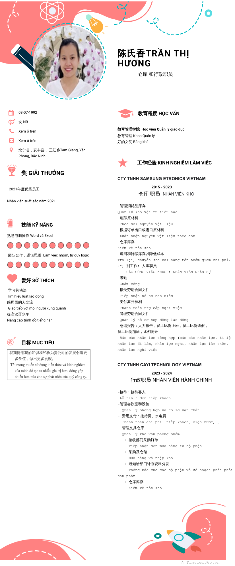 Xem hồ sơ ứng viên 陈氏香trần thị hương cần 2 điểm. Hồ sơ được cập nhật ngày: 24/11/2024