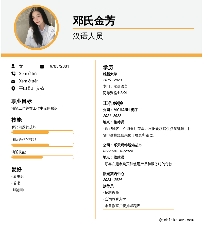 Xem hồ sơ ứng viên 邓氏金芳 cần 2 điểm. Hồ sơ được cập nhật ngày: 10/11/2024