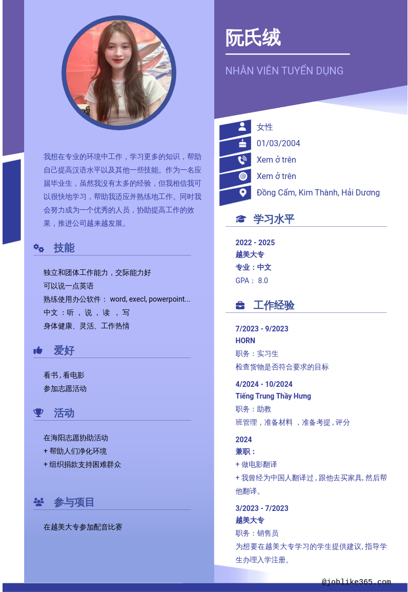 Xem hồ sơ ứng viên 阮氏绒 cần 2 điểm. Hồ sơ được cập nhật ngày: 21/11/2024