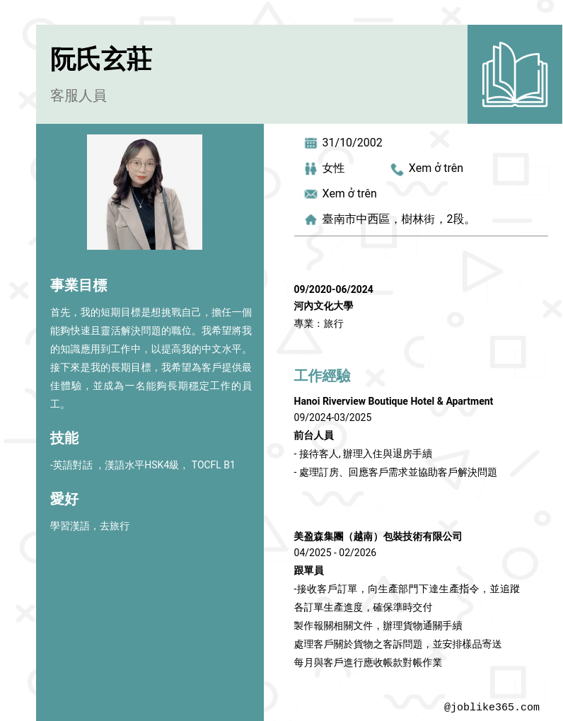 Xem hồ sơ ứng viên 阮氏玄莊 cần 2 điểm. Hồ sơ được cập nhật ngày: 15/04/2026