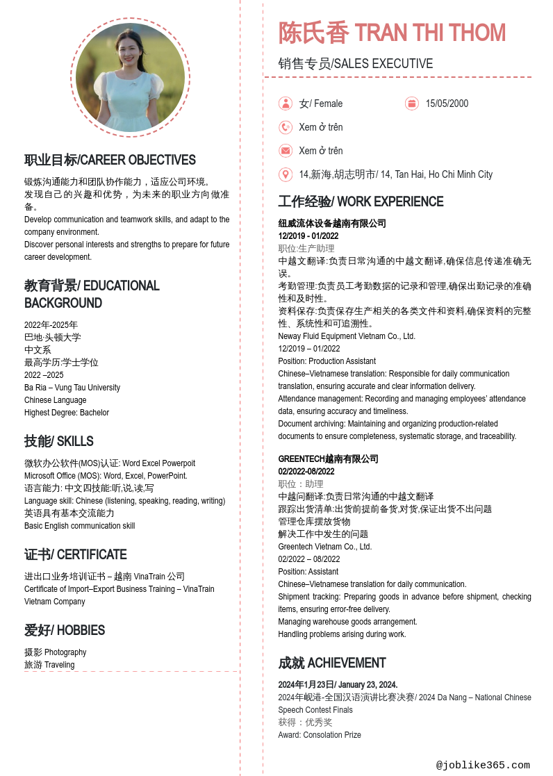 Xem hồ sơ ứng viên 陈氏香 TRaN THi thom cần 2 điểm. Hồ sơ được cập nhật ngày: 08/12/2025