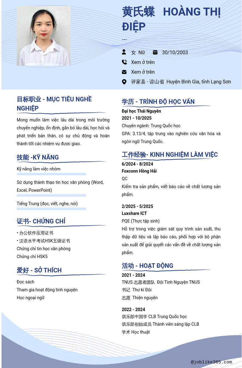 Xem hồ sơ ứng viên 黄氏蝶 HOÀNG THỊ ĐIỆP cần 2 điểm. Hồ sơ được cập nhật ngày: 22/07/2025