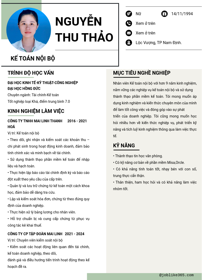 Xem hồ sơ ứng viên NGUYỄN THU THẢO cần 2 điểm. Hồ sơ được cập nhật ngày: 12/06/2025