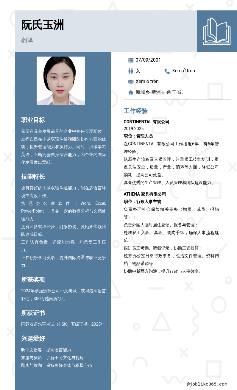 Xem hồ sơ ứng viên 阮氏玉洲 cần 2 điểm. Hồ sơ được cập nhật ngày: 26/06/2025