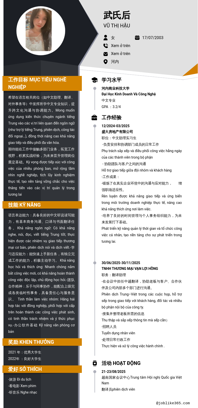 Xem hồ sơ ứng viên 武氏后 cần 2 điểm. Hồ sơ được cập nhật ngày: 16/12/2025