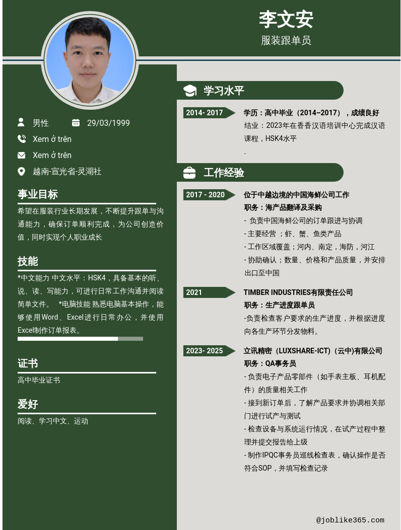 Xem hồ sơ ứng viên 李文安 cần 2 điểm. Hồ sơ được cập nhật ngày: 05/02/2026