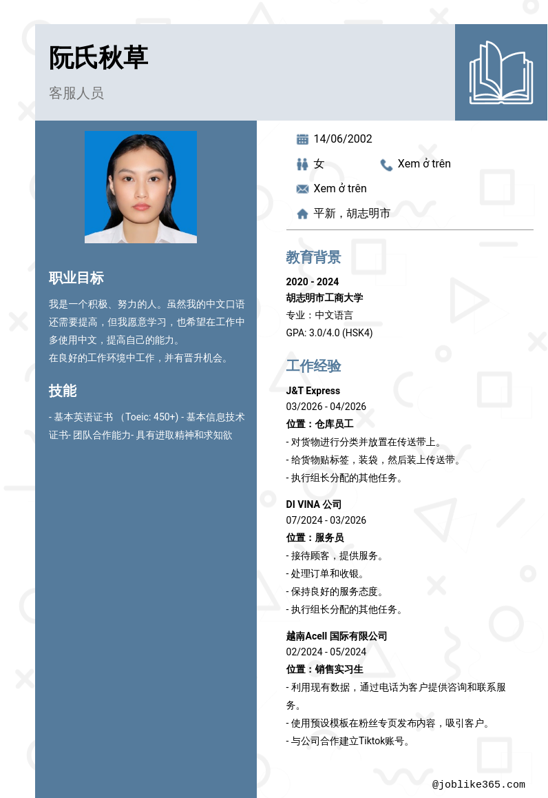 Xem hồ sơ ứng viên 阮氏秋草 cần 2 điểm. Hồ sơ được cập nhật ngày: 06/04/2026