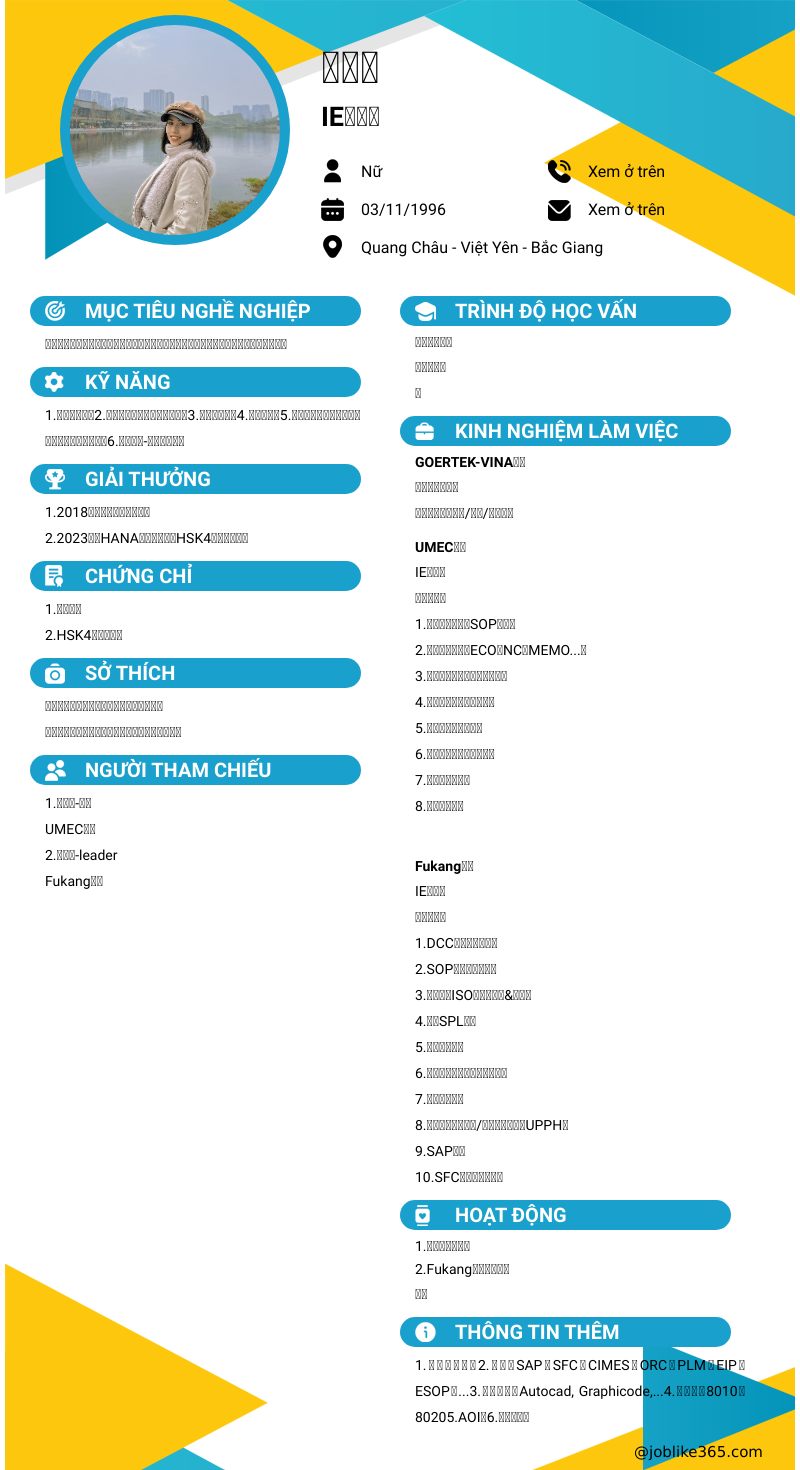 Xem hồ sơ ứng viên 裴梅清 cần 2 điểm. Hồ sơ được cập nhật ngày: 25/07/2024