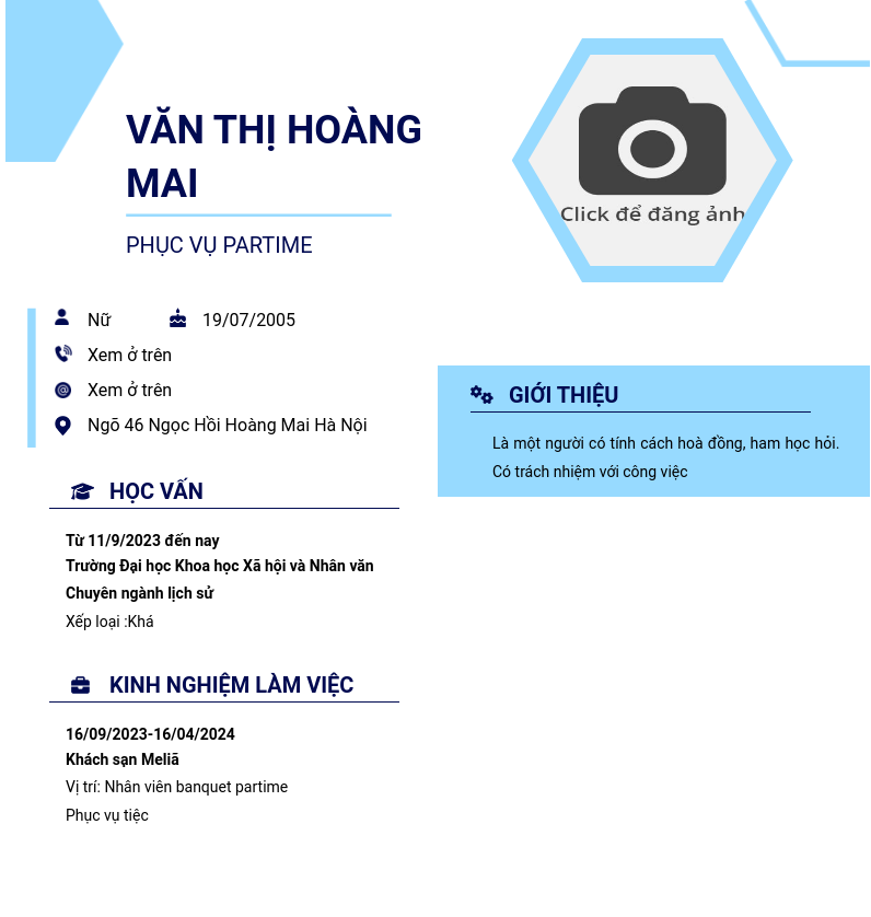 Xem hồ sơ ứng viên VĂN THỊ HOÀNG MAI cần 2 điểm. Hồ sơ được cập nhật ngày: 11/06/2024