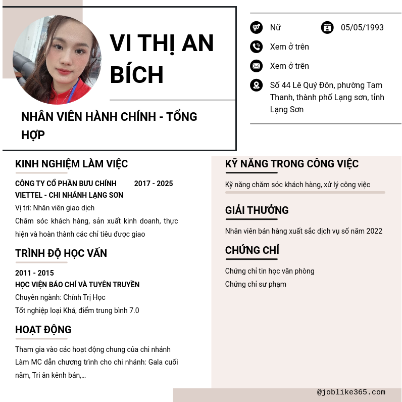 Xem hồ sơ ứng viên Vi Thị An Bích cần 2 điểm. Hồ sơ được cập nhật ngày: 06/01/2025