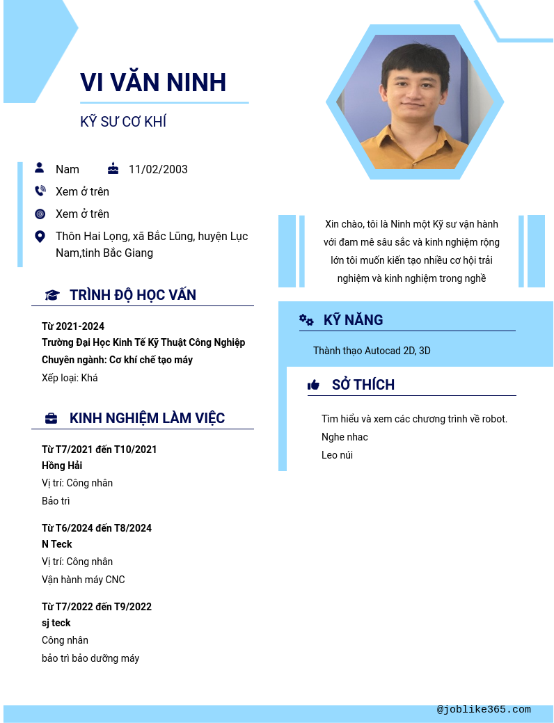 Xem hồ sơ ứng viên Vi Văn Ninh cần 2 điểm. Hồ sơ được cập nhật ngày: 04/10/2024
