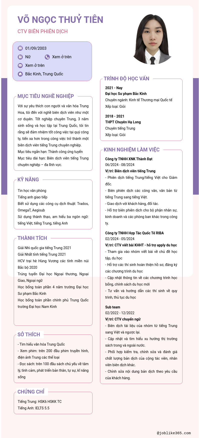 Xem hồ sơ ứng viên võ ngọc thuỷ tiên cần 2 điểm. Hồ sơ được cập nhật ngày: 26/09/2024