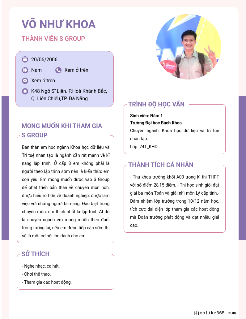 Xem hồ sơ ứng viên VÕ NHƯ KHOA cần 2 điểm. Hồ sơ được cập nhật ngày: 06/11/2024