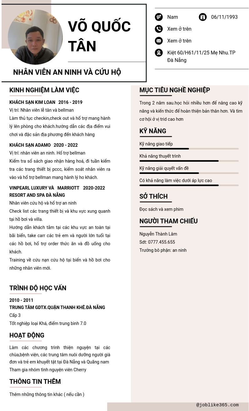 Xem hồ sơ ứng viên Võ quốc tân cần 2 điểm. Hồ sơ được cập nhật ngày: 02/01/2025