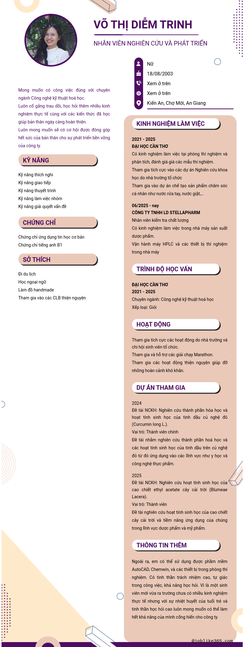 Xem hồ sơ ứng viên Võ Thị Diễm Trinh cần 2 điểm. Hồ sơ được cập nhật ngày: 20/08/2025